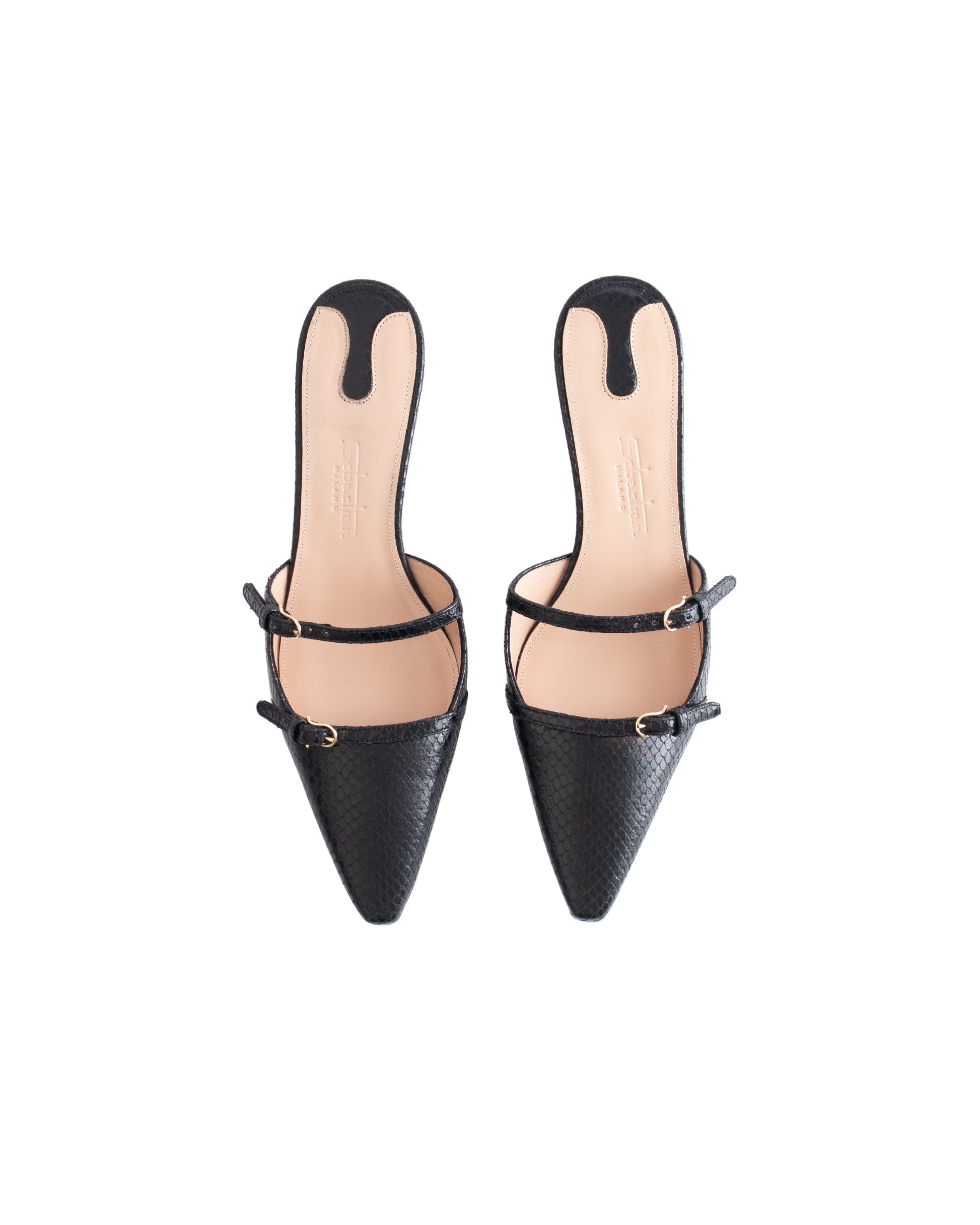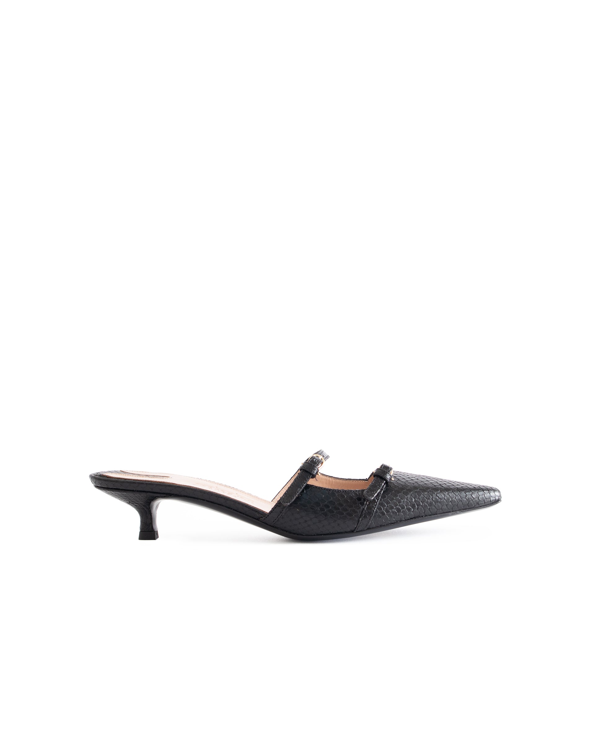 - Upper: black snake skin leather and silver buckles