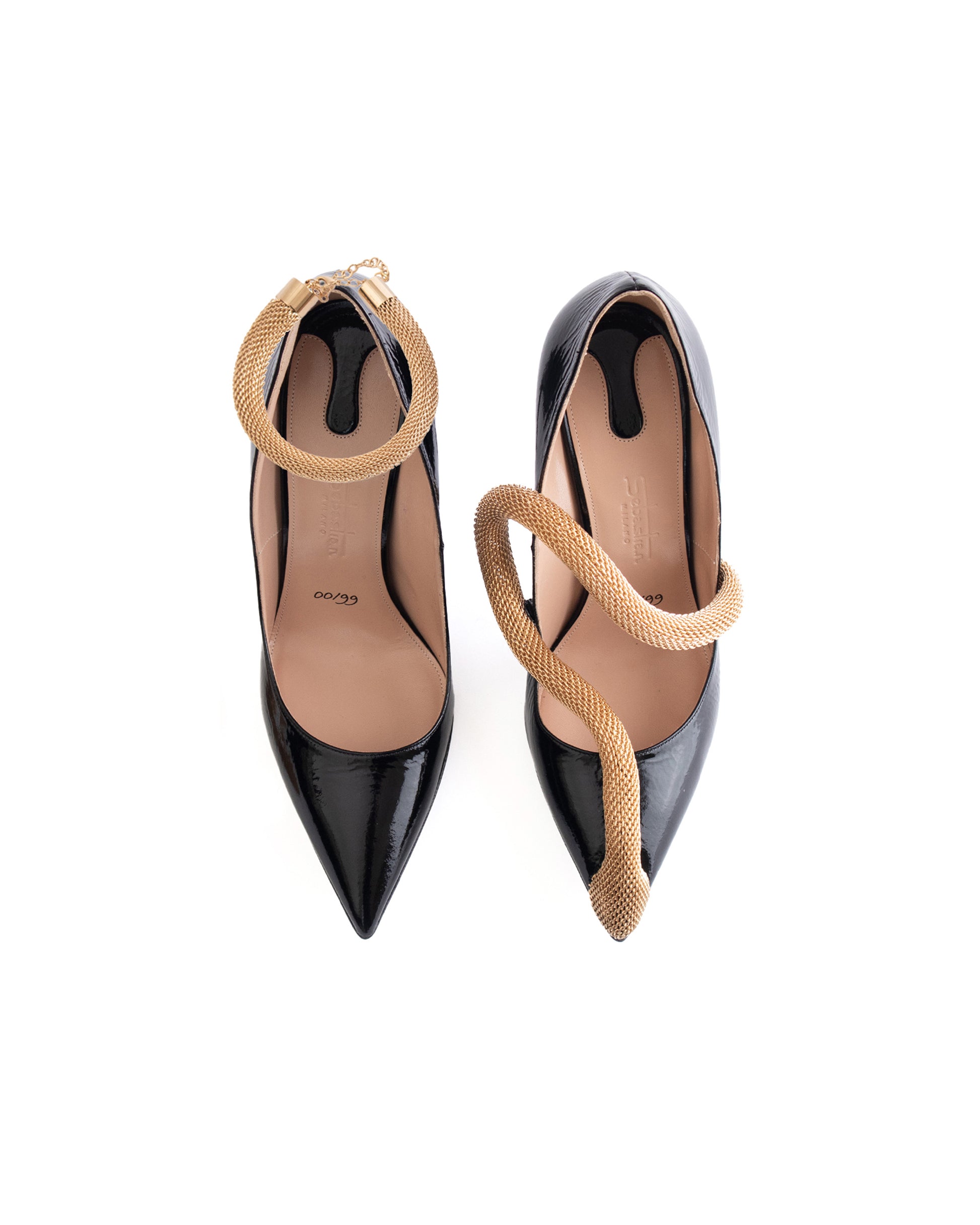 Introducing EVA, a limited edition pump inspired by Walter Crane’s The Serpent Seduces Eve, reimagining the allure of temptation through refined craftsmanship. A golden serpent winds from toe to ankle, transforming into a detachable jewel — a seamless union of mythology, sensuality, and modern design. Produced in just 99 pairs, each individually numbered.